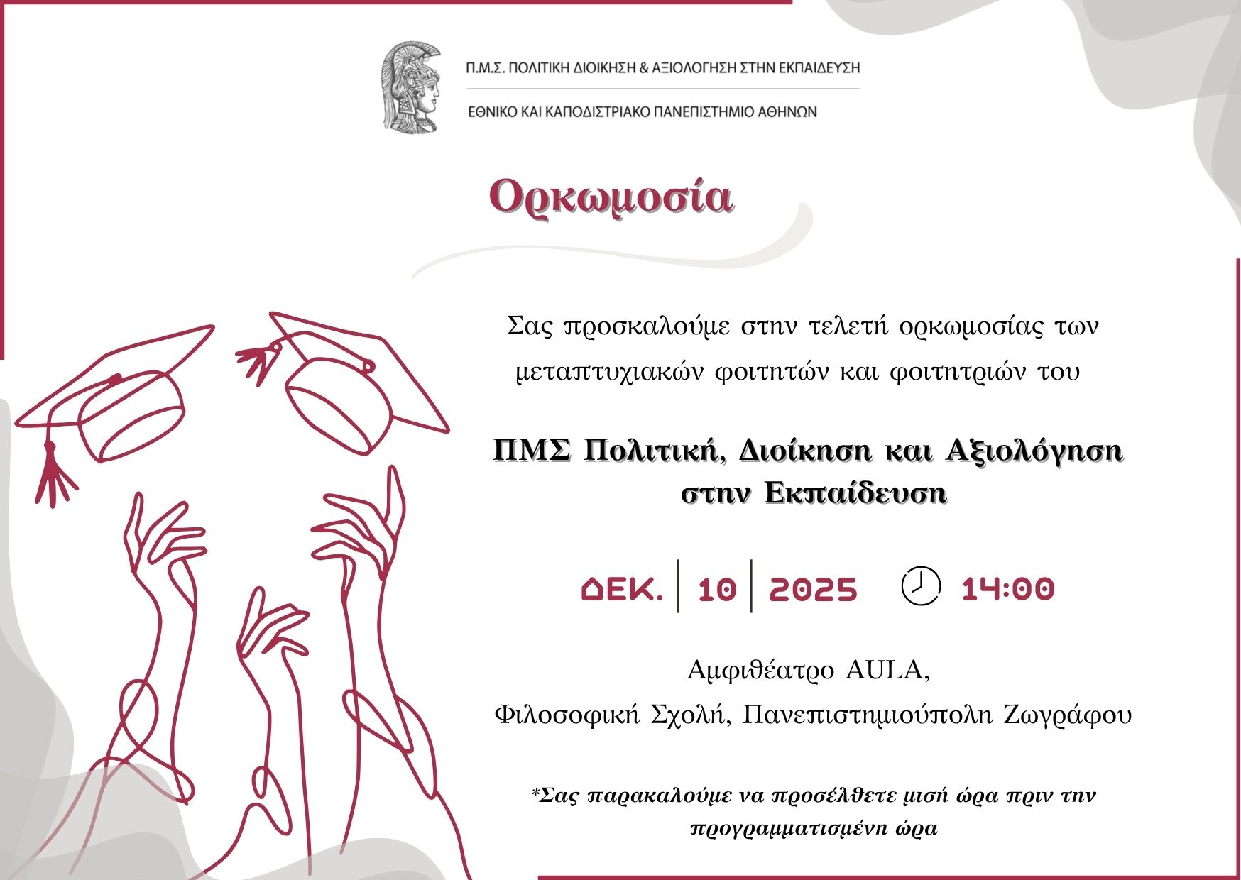 Η επόμενη ορκωμοσία των μεταπτυχιακών φοιτητών και φοιτητριών του ΠΜΣ Πολιτική, Διοίκηση και Αξιολόγηση στην Εκπαίδευση θα διεξαχθεί την Τετάρτη 10 Δεκεμβρίου 2025 και ώρα 14:00.